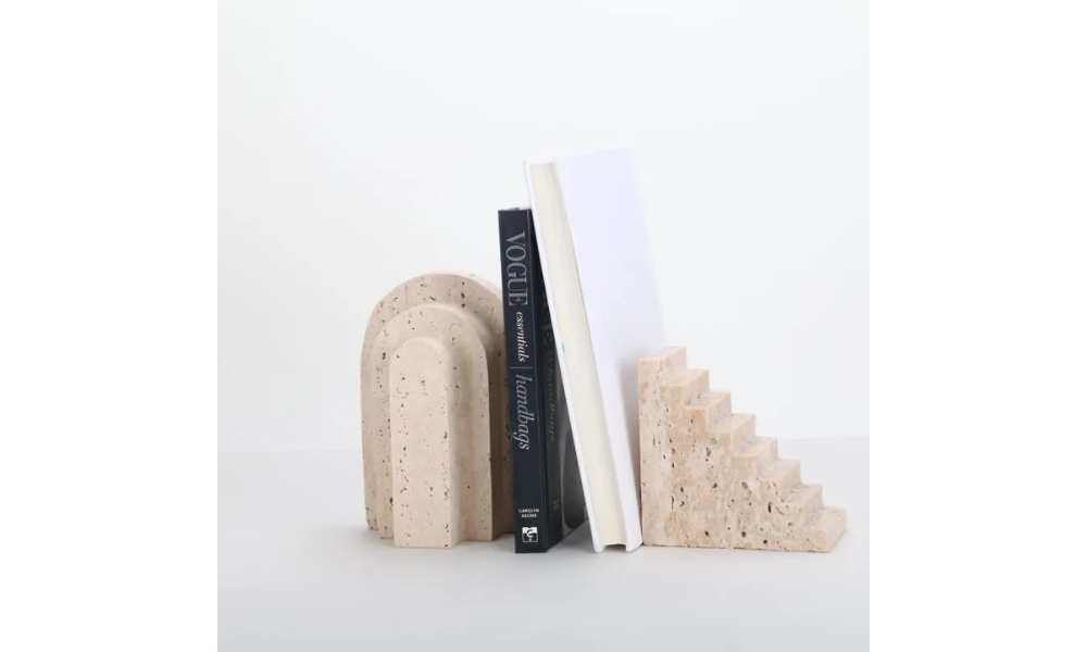 Elegant beige stone arch with intricately carved stairs, perfect for adding a classic architectural touch while keeping your books neatly organized and stylishly displayed on any shelf or desk.