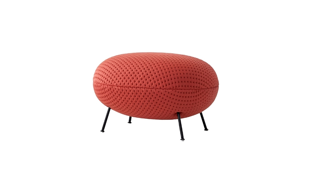A vibrant red, oval-shaped, puffy upholstered chair with sleek black metal legs, combining modern design with bold color to create a striking, contemporary accent piece.