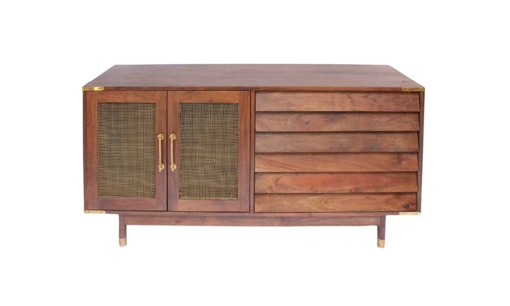 A stylish brown wooden cane and streps design door-side board, blending rustic charm with modern elegance, perfect for adding functional beauty to any space.