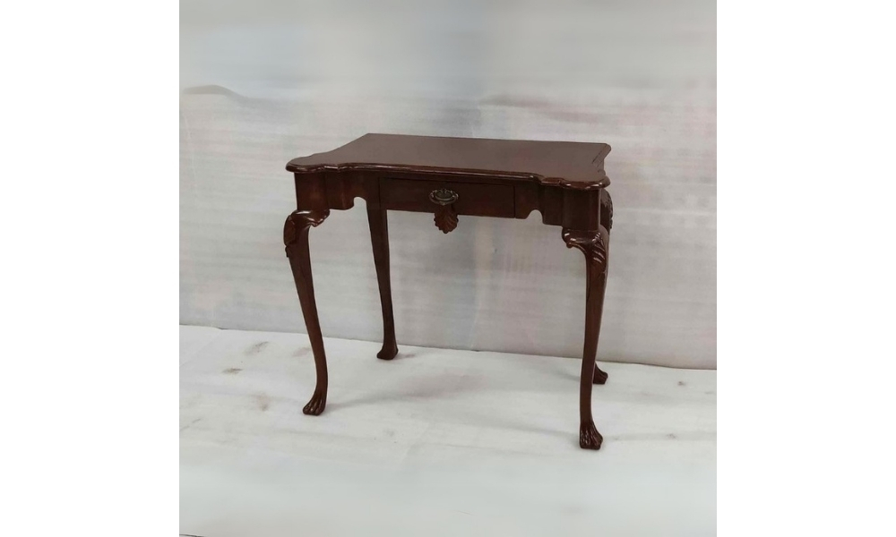 Dark brown wooden console table with ornate carvings, a functional drawer for storage, perfect for enhancing living room aesthetics