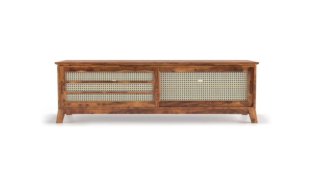 A stylish dark brown wooden TV unit featuring elegant cane sliding doors, perfect for adding a touch of sophistication and functional storage to your living space.