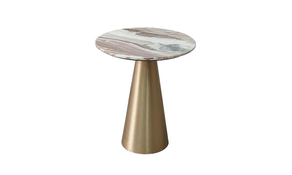 This elegant side table features a dark pink Italian marble top paired with a sleek cone-shaped golden metal base, adding a touch of luxury to any space.