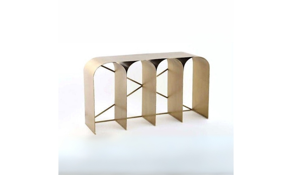 A sleek, elegant console table featuring a golden metal frame and four spacious shelves, perfect for modern interiors, adding luxury and functionality to any room.
