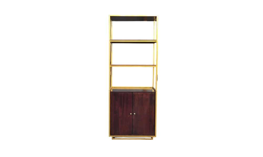 A sleek, golden metal-framed bookshelf with two dark brown wooden doors, combining modern elegance with rustic charm, perfect for stylish storage and display in any room.