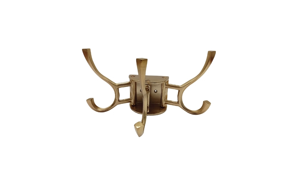 A sleek, golden metal wall hook with a half-round design, featuring three sturdy hooks for hanging coats, bags, or accessories. Elegant and functional for any space.