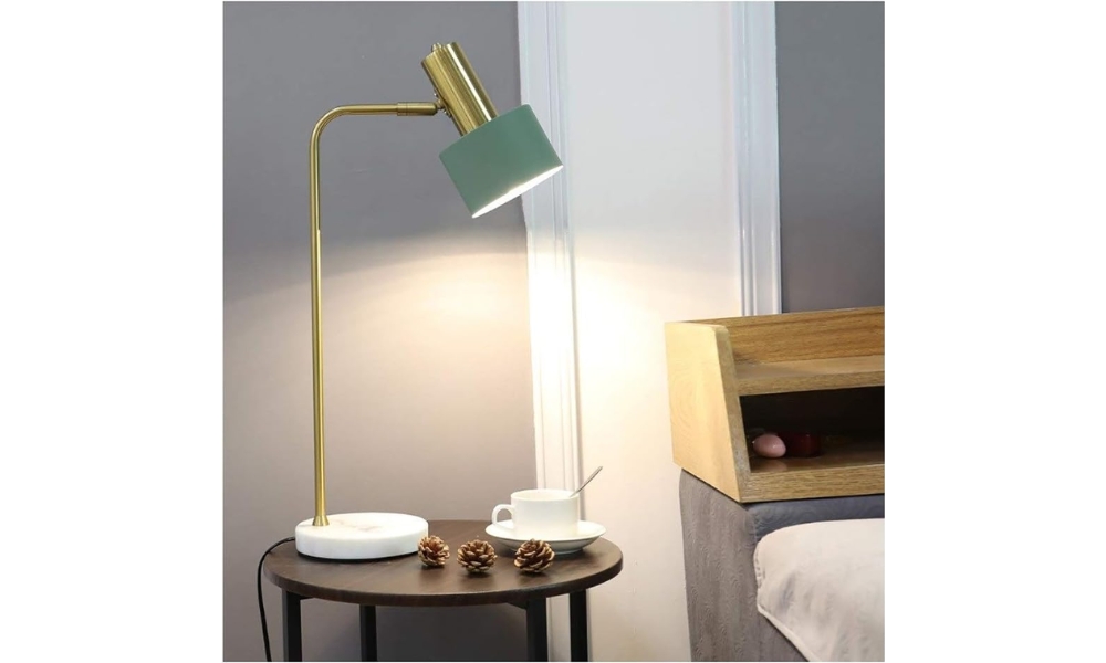 A stylish study lamp featuring a golden metal body, rich green shade, and sturdy white marble base. Perfect blend of luxury and focused lighting.