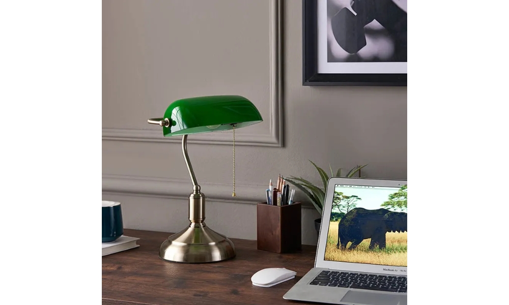 A timeless study lamp featuring a green glass shade, brass stand, and sturdy base—perfect for adding vintage charm and focused lighting to your workspace.