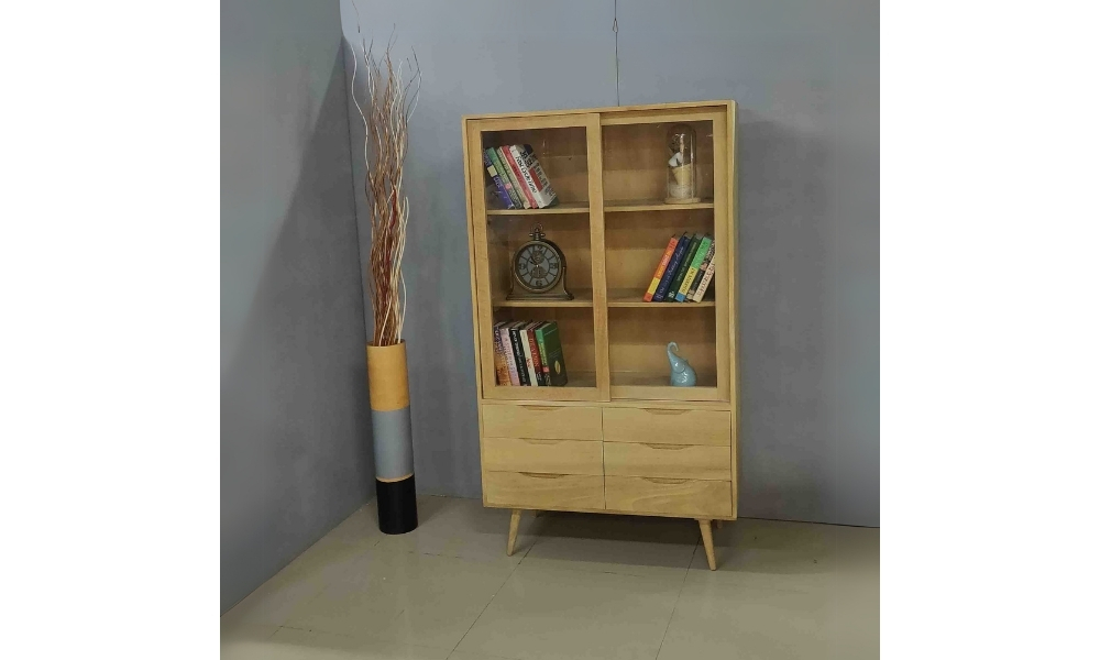 Light wooden bookshelf with six spacious drawers, ideal for books, decor, or storage. Minimalist design adds warmth and functionality to any home, office, or studio setup.