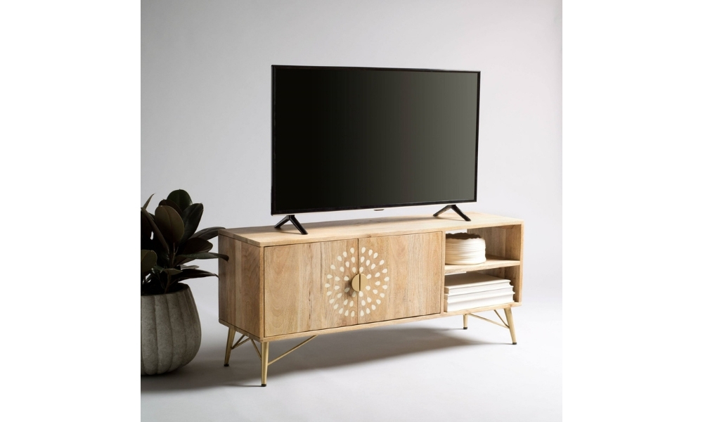 A stylish light wooden TV unit with a dotted design on the doors, offering a modern touch to your living space with ample storage and elegance.