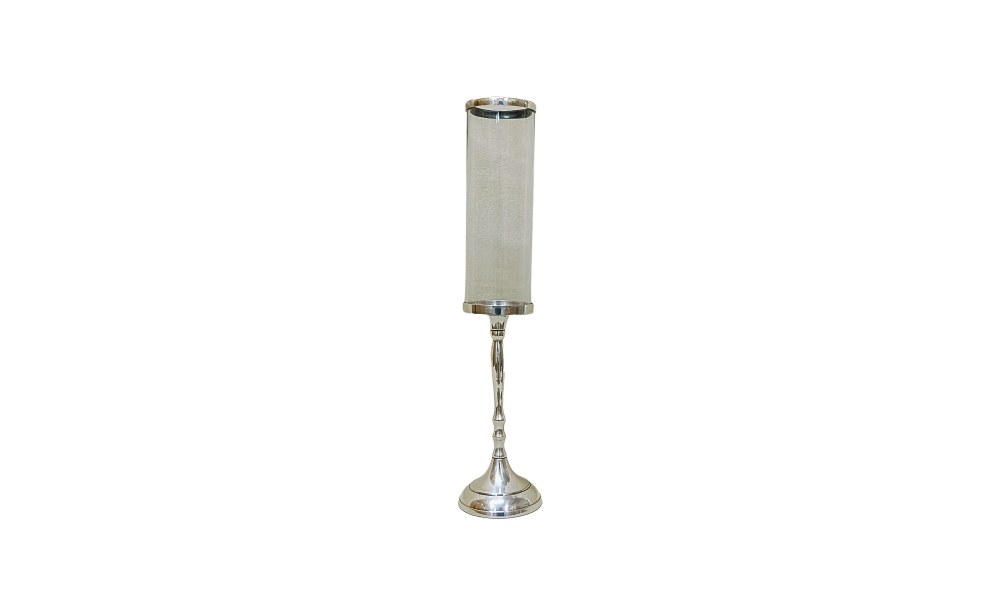 This small silver metal candle stand features intricate carvings and a polished finish. Perfect for tabletops or mantels, it adds timeless charm and soft candlelight to any space.