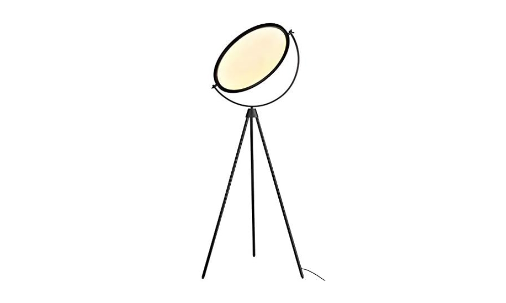 This floor lamp features a minimalist white shade and a durable black metal tripod base, perfect for adding sophistication and ambiance to any living space.