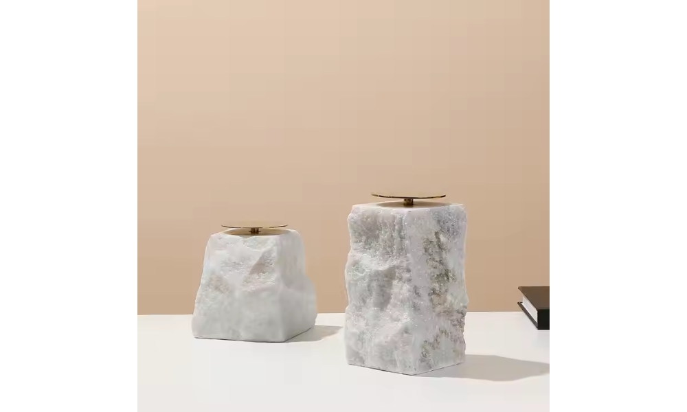 Chic white marble candle stand with a sleek round top supported by golden metal, ideal for enhancing ambiance with a stylish, minimalist design perfect for homes, weddings, or special occasions.