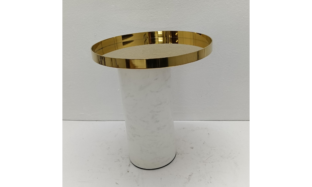 A stylish round white marble base with a shiny golden dish candle holder on top. This large piece combines classic elegance and modern design, perfect for enhancing ambiance in any space.