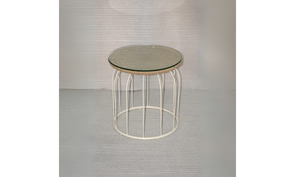 A sleek and modern side table featuring a white metal base with a minimalist glass top, perfect for adding a touch of elegance to any space.