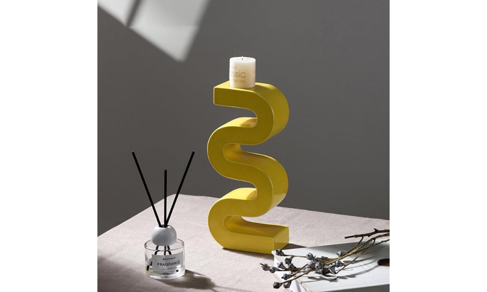 This yellow ceramic candle stand showcases a unique zig zag S-shape, blending contemporary style with functionality. Ideal for elegant home décor or creating a cozy ambiance with candles.