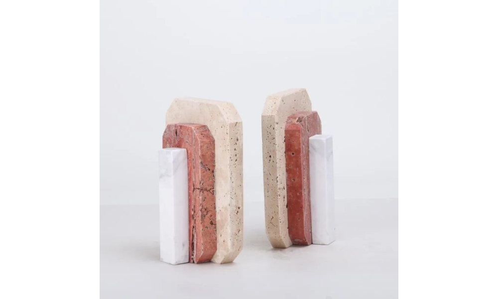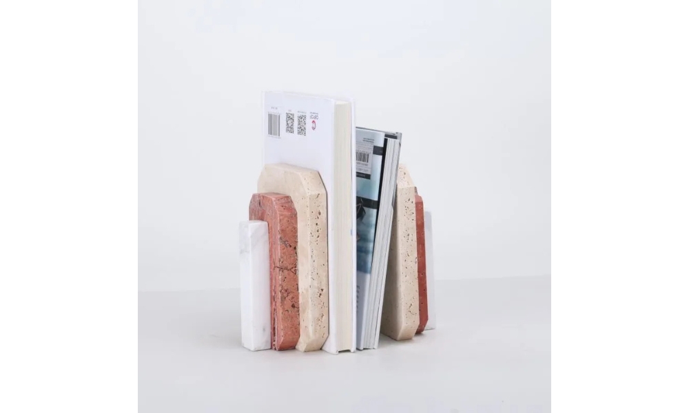 Elegant beige, red ochre, and white stone bookend adds rustic charm and stability to your bookshelf. Perfect for home or office décor, blending natural tones with sturdy craftsmanship.