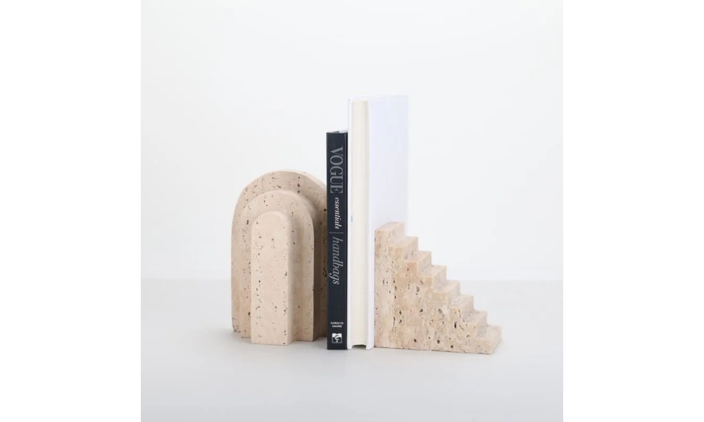 Elegant beige stone arch with intricately carved stairs, perfect for adding a classic architectural touch while keeping your books neatly organized and stylishly displayed on any shelf or desk.