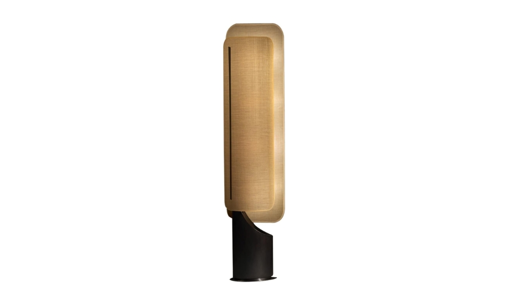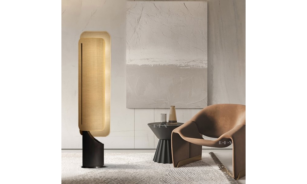A stylish floor lamp with a beige-white line-plated shade and a sturdy black metal base. Perfect for contemporary interiors, offering both design and functional lighting.