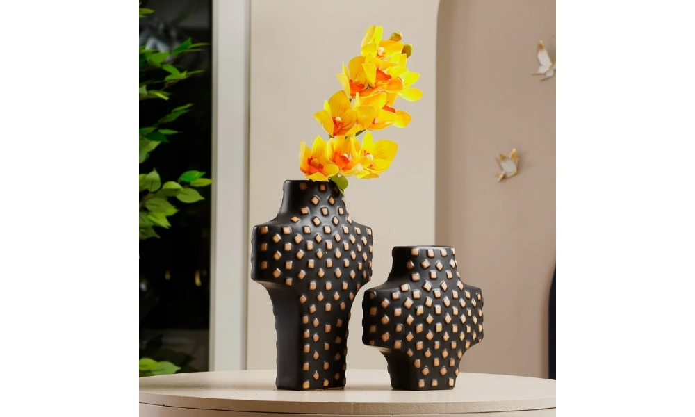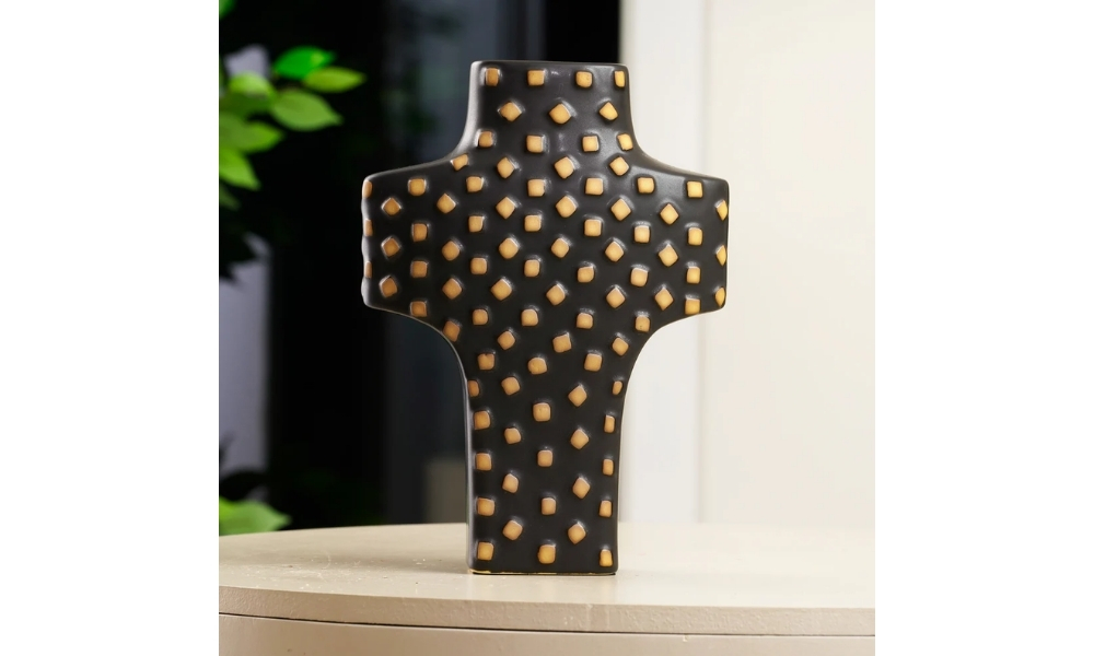 This large black ceramic vase features a unique plus-shaped design with textured brown square accents, combining bold geometry and tactile detail. Perfect as a striking centerpiece or modern decor statement.
