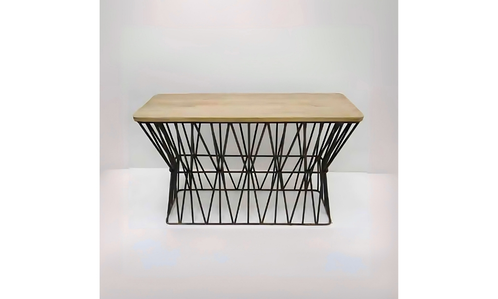 A sleek, modern console table featuring a black metal base and a light wooden rectangular top, perfect for adding elegance and functionality to any space.