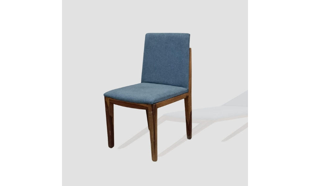 Experience refined dining with this chair, crafted from a sturdy brown wooden base and draped in luxurious blue fabric, designed to provide both aesthetic appeal and lasting comfort for family dinners.