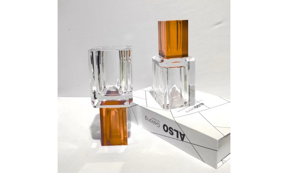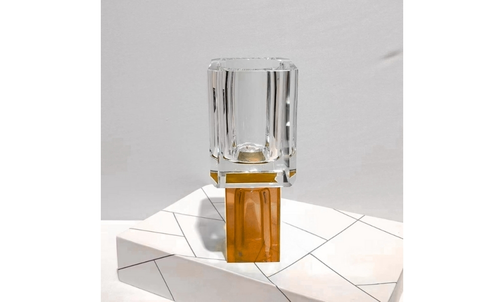 A vibrant orange crystal vase with a sleek square base. Perfect for modern settings, adding a pop of color and sophistication to any décor.