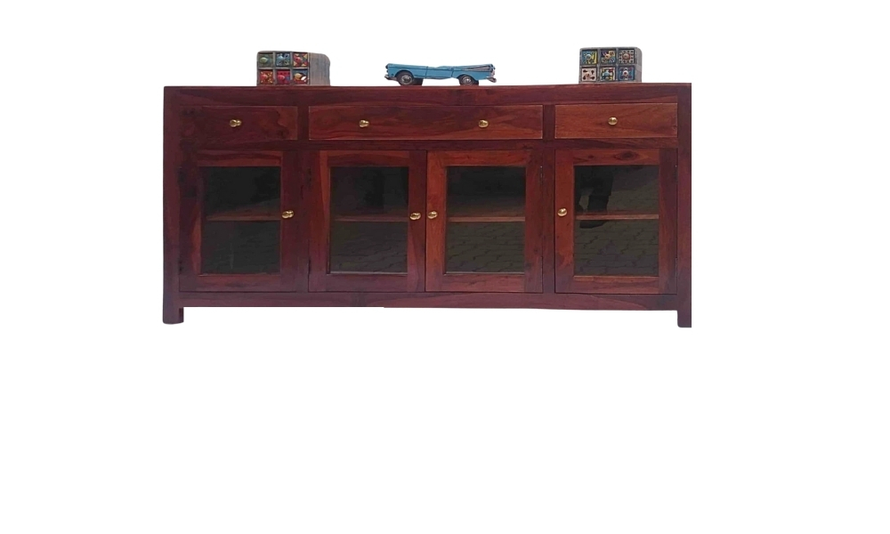 A sleek, dark brown wooden sideboard featuring 3 drawers and 4 glass doors, offering ample storage space and a sophisticated design perfect for any home or office.