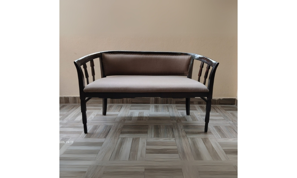 A sleek and elegant dark brown wooden 3-seater sofa with soft, durable brown fabric upholstery, offering comfort and style for any living space or office.