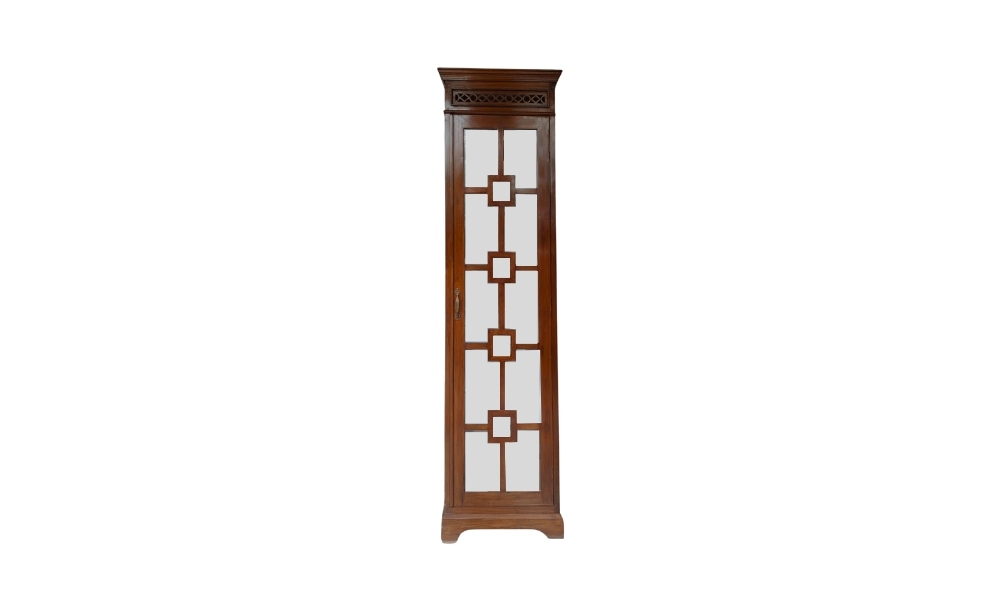Elegant dark brown wooden cabinet with intricate carved design on top and clear glass side panels. Perfect for showcasing décor, collectibles, or fine dinnerware with style.