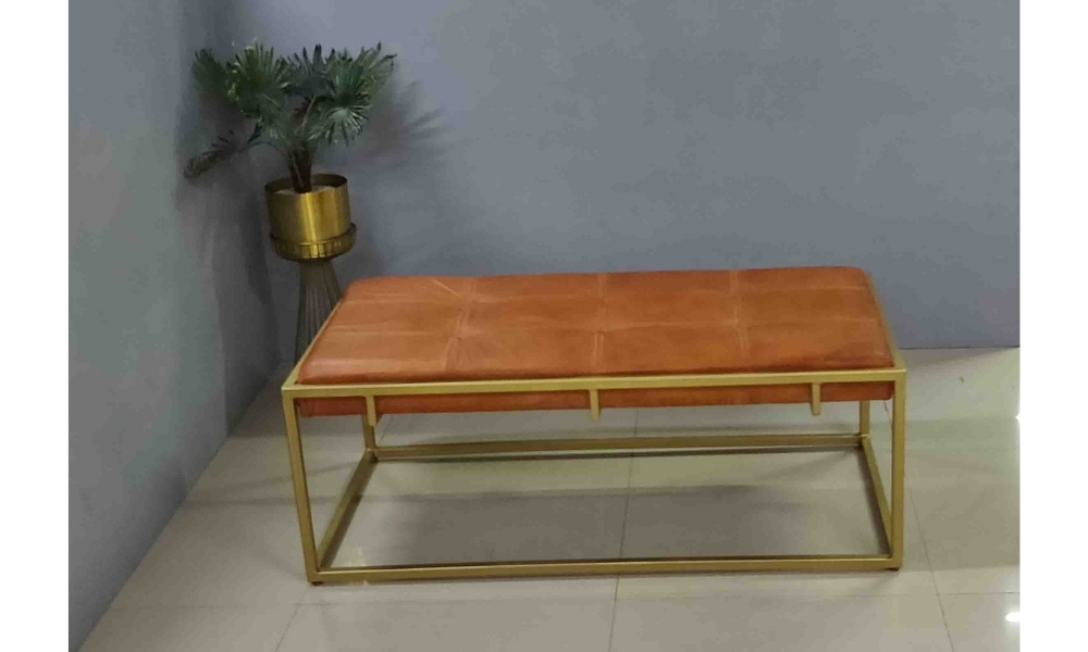 This stylish bench with a golden metal base and brown leather top adds a touch of sophistication to modern interiors
