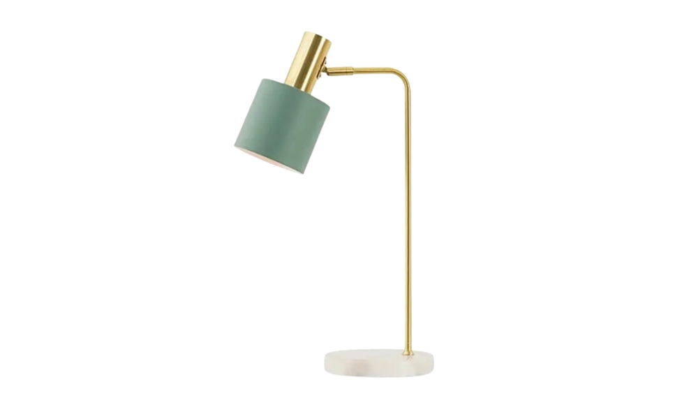 A stylish study lamp featuring a golden metal body, rich green shade, and sturdy white marble base. Perfect blend of luxury and focused lighting.