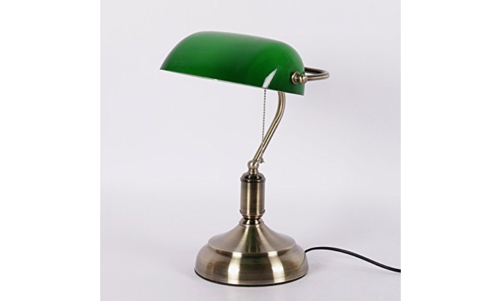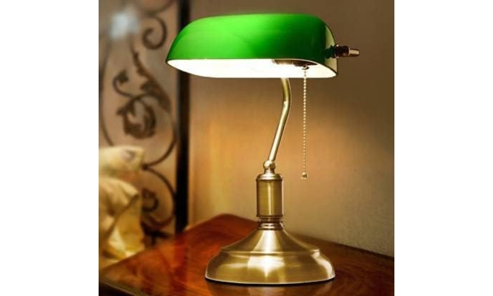 A timeless study lamp featuring a green glass shade, brass stand, and sturdy base—perfect for adding vintage charm and focused lighting to your workspace.