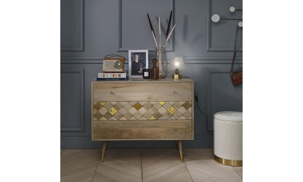 This elegant light wooden sideboard features intricate golden carved cube designs, offering a blend of modern sophistication and timeless charm for any living space or decor.