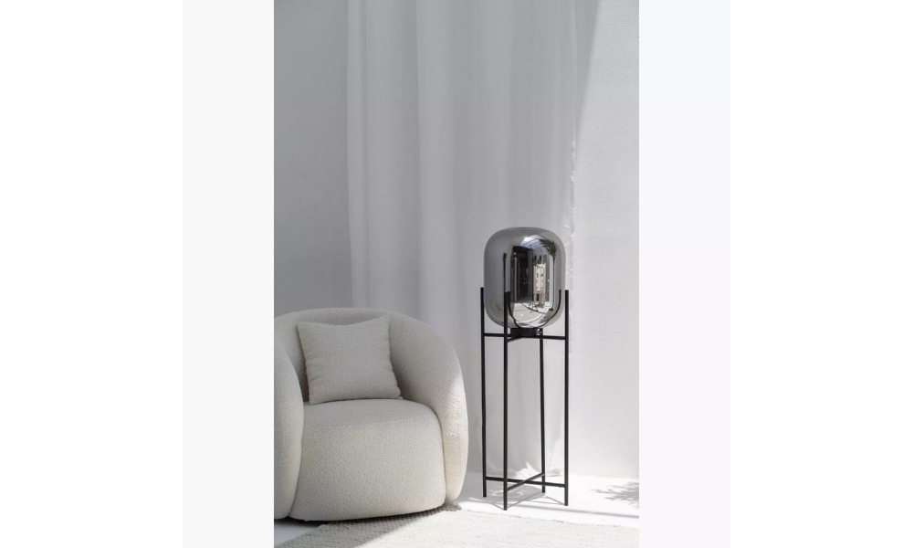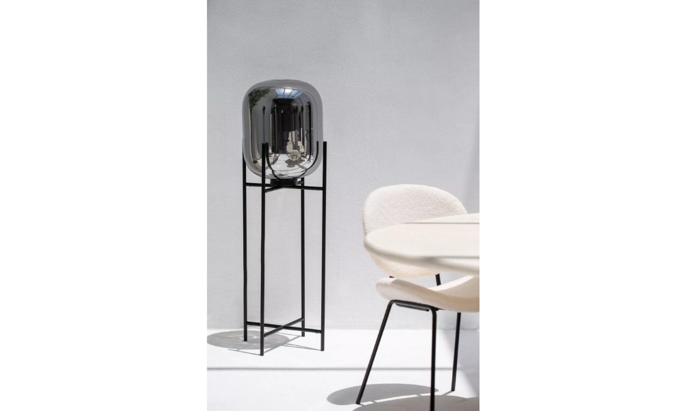 Chic floor lamp with a sturdy quad-leg black metal base and a striking silver reflective balloon shade, perfect for adding contemporary elegance to your space.