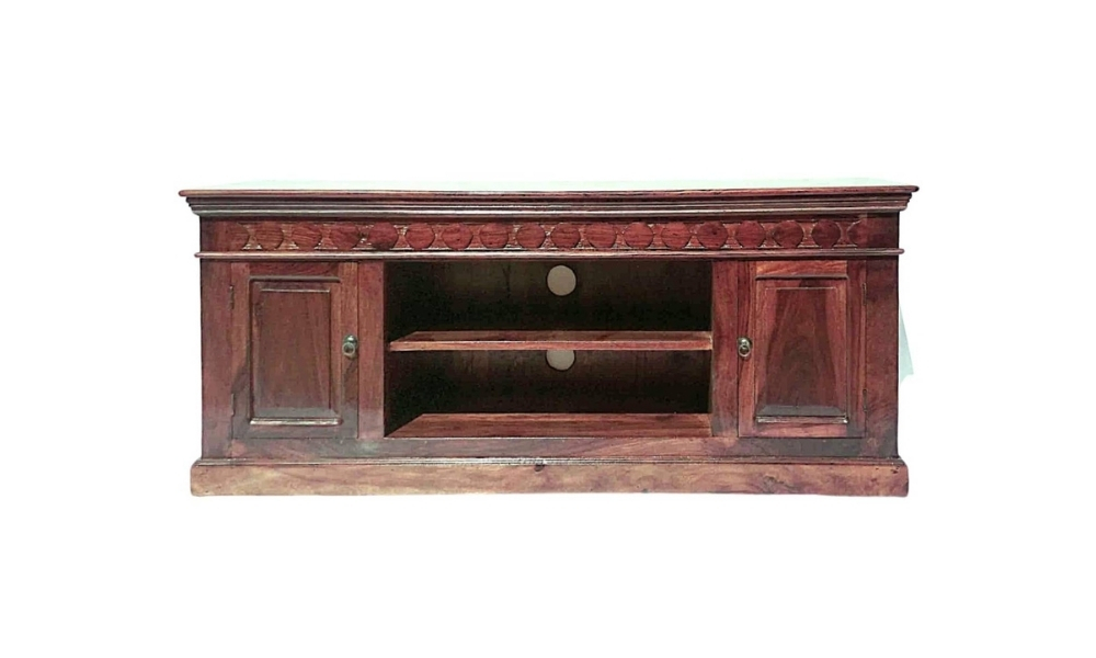 A stylish reddish-brown wooden TV unit with two spacious doors, offering ample storage space while adding a touch of warmth and elegance to your living room.