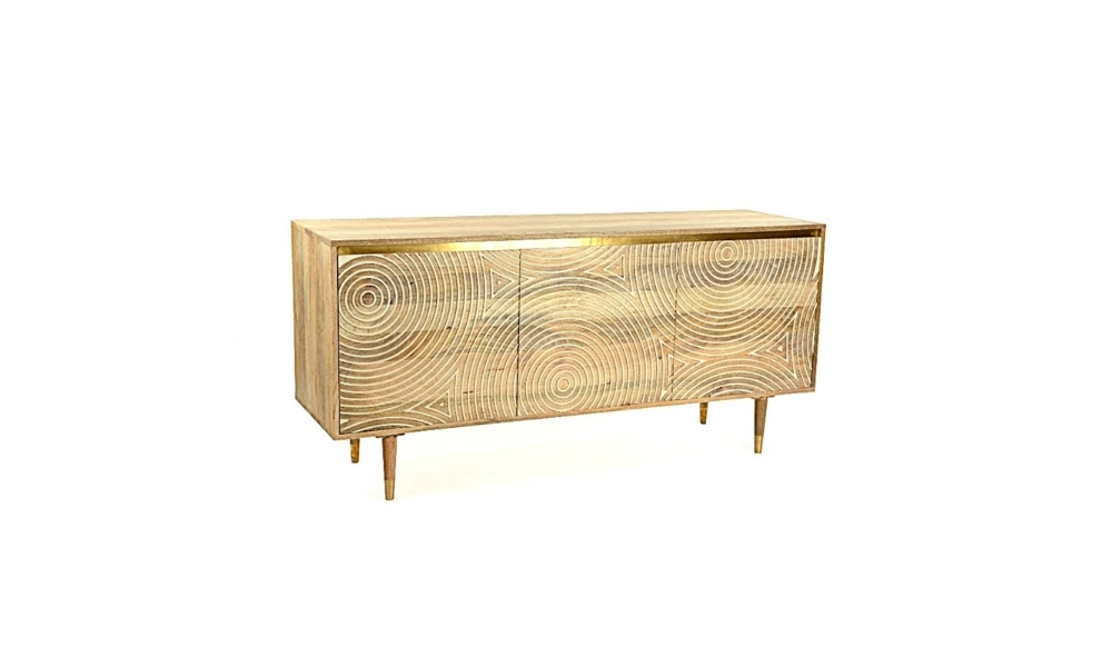 A sleek, light wooden sideboard featuring a golden ring design on the doors, offering a sophisticated and elegant storage solution with a modern touch.