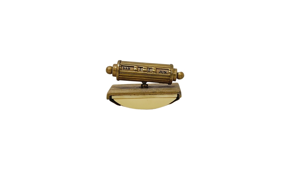 Antique brass calendar paperweight with rocking design. Combines practicality with old-world charm, ideal for stylish desks or study areas.