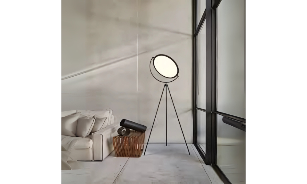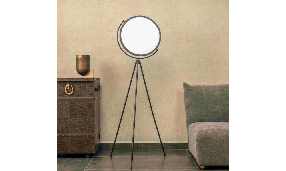 This floor lamp features a minimalist white shade and a durable black metal tripod base, perfect for adding sophistication and ambiance to any living space.