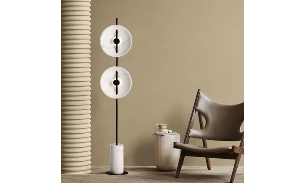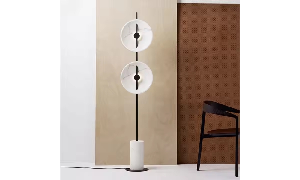 This elegant floor lamp features a white marble double-plated shade and sleek black metal base, adding a touch of sophistication and modern charm to any space.