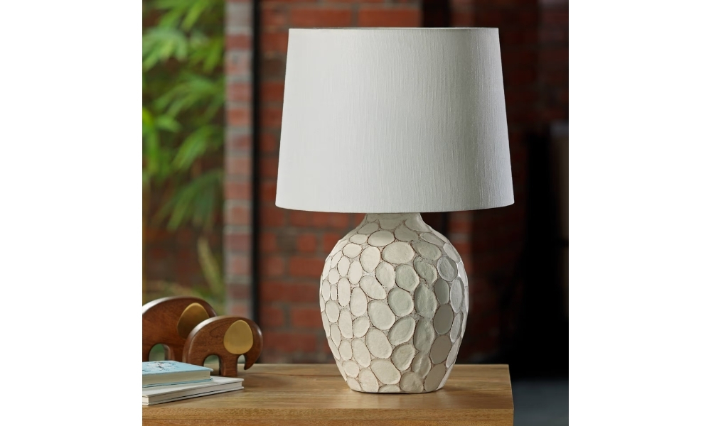 This big, round table lamp boasts a beautiful white wooden texture with delicate carvings, creating a perfect blend of elegance and rustic charm for your room.