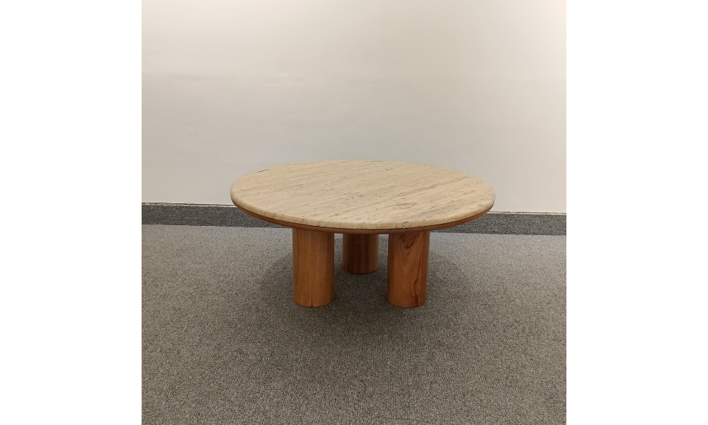Rent this sophisticated, used center table featuring a stunning beige marble top. Its elegant dark wooden three-leg base provides a striking contrast, making it a perfect statement piece for any living room, lounge, or event setting. Add timeless style to your space.